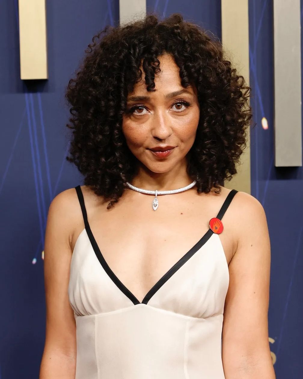 Рут Негга надела платье цвета слоновой кости от Prada и колье-торк с бриллиантовой подвеской от Messika (стилист Карла Уэлч).
