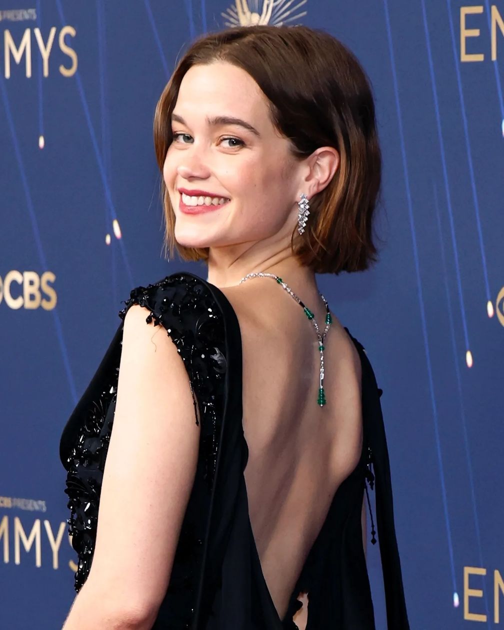 Молли Гордон надела винтажное платье в черно-белую полоску без бретелек от Giorgio Armani и изысканное платиновое ожерелье с бриллиантами от Tiffany & Co. Актриса дополнила образ серьгами с бриллиантами в 5 карат, кольцом Jean Schlumberger от Tiffany & Co. с шестнадцатью камнями и кольцом вечности с бриллиантами общим весом более 5 карат.