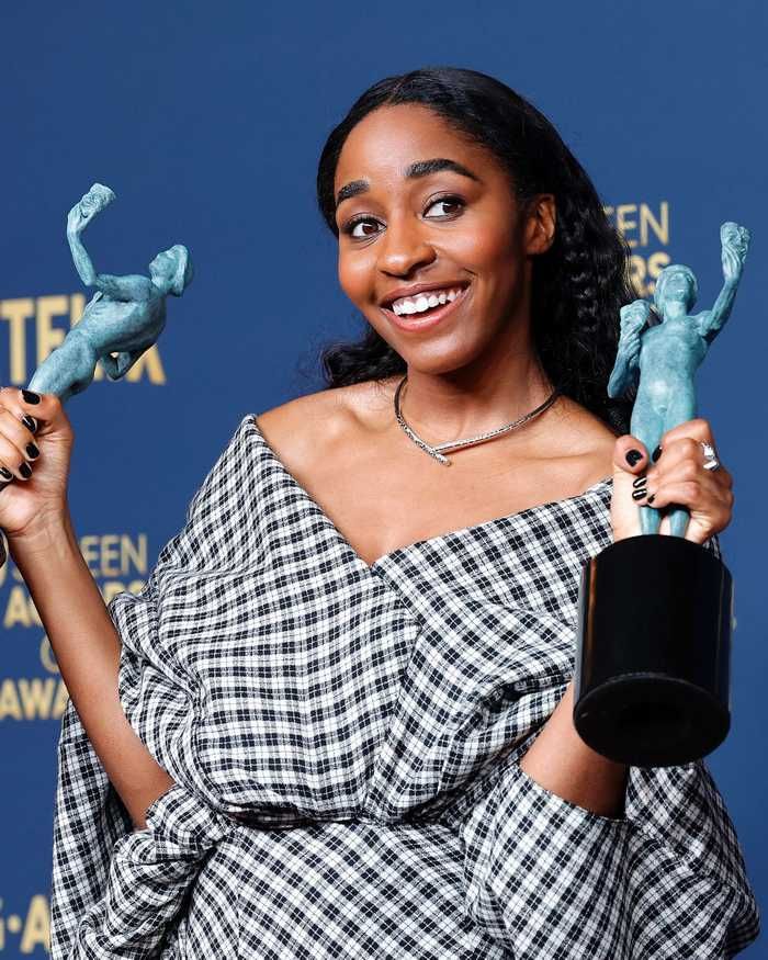 Айо Эдебири провела триумфальную ночь на церемонии вручения премии Гильдии киноактеров, забрав два трофея. На ней было платье от Luar, дополненное чокером Oera из белого золота и бриллиантов от Tabayer, каффами и кольцами (стилист – Даниэль Голдберг).