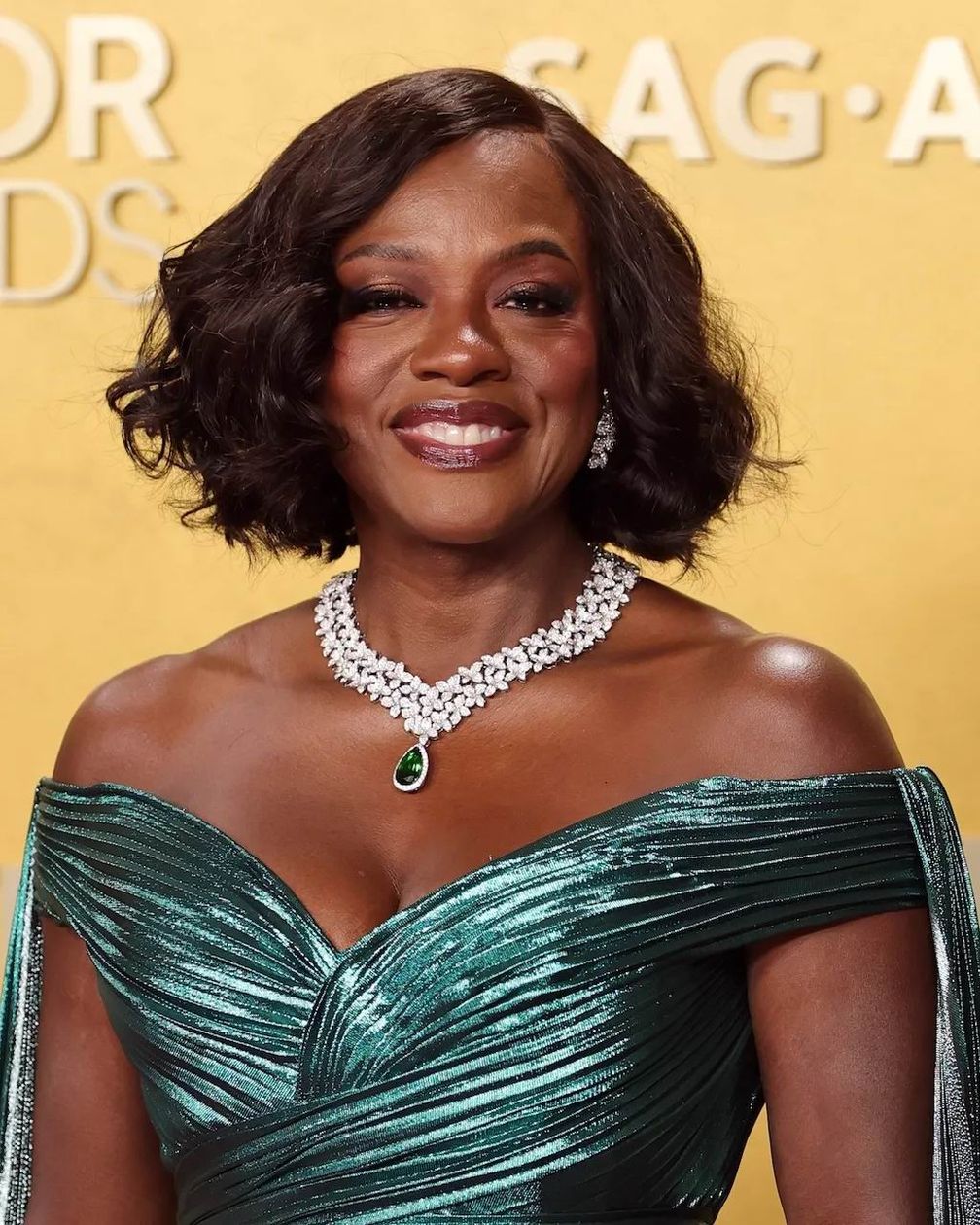 Ведущая вечера Виола Дэвис прошла по красной дорожке в мерцающем изумрудном платье с открытыми плечами, дополненном цветочным ожерельем из природных бриллиантов и изумрудной подвеской в форме груши от Pasquale Bruni.