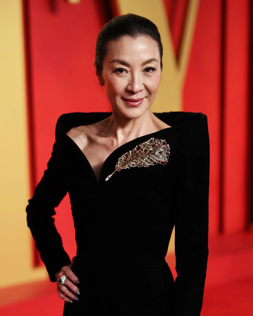 Лауреат премии «Оскар» Мишель Йео выбрала классическое черное платье Balenciaga Couture для вечеринки, украсив его огромной брошью Lumière Feather, приколотой к структурному вырезу.) Йео надела шедевр Black Label, созданный ювелиром Синди Чао (The Art Jewel, включающий 19-каратный бриллиант в форме сердца и 2 419 акцентных бриллиантов. Общий вес бриллиантов в броши составляет 189,15 карата. Звезда «Всё везде и сразу» также дополнила свой образ коктейльным кольцом с бриллиантом и изумрудом из коллекции White Label.