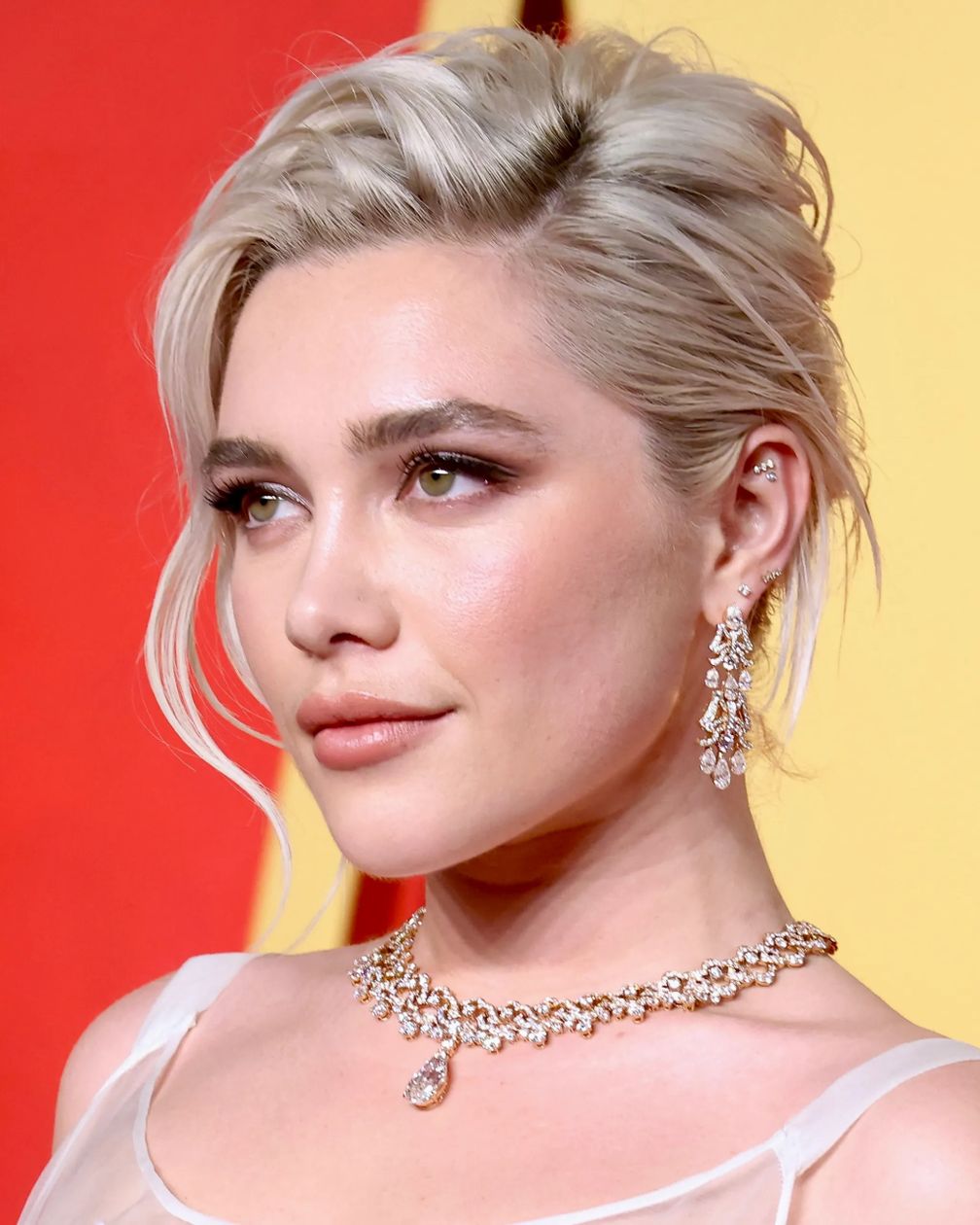 Флоренс Пью блистала на красной дорожке в украшениях от Bulgari, включая колье из бриллиантов и драматичные серьги-люстры, которые она надела с платьем из коллекции Simone Rocha Haute Couture для Jean Paul Gaultier.
