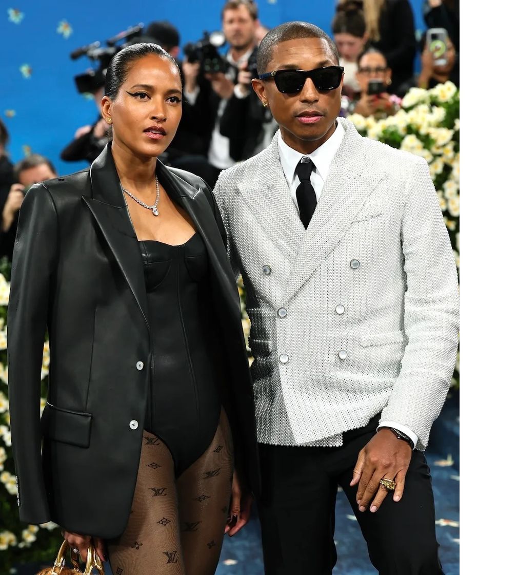 Один из сопредседателей Met Gala, креативный директор мужской одежды Louis Vuitton Фаррелл Уильямс и его жена Хелен Ласичан вышли на красную дорожку в бриллиантовых украшениях от Tiffany & Co.
