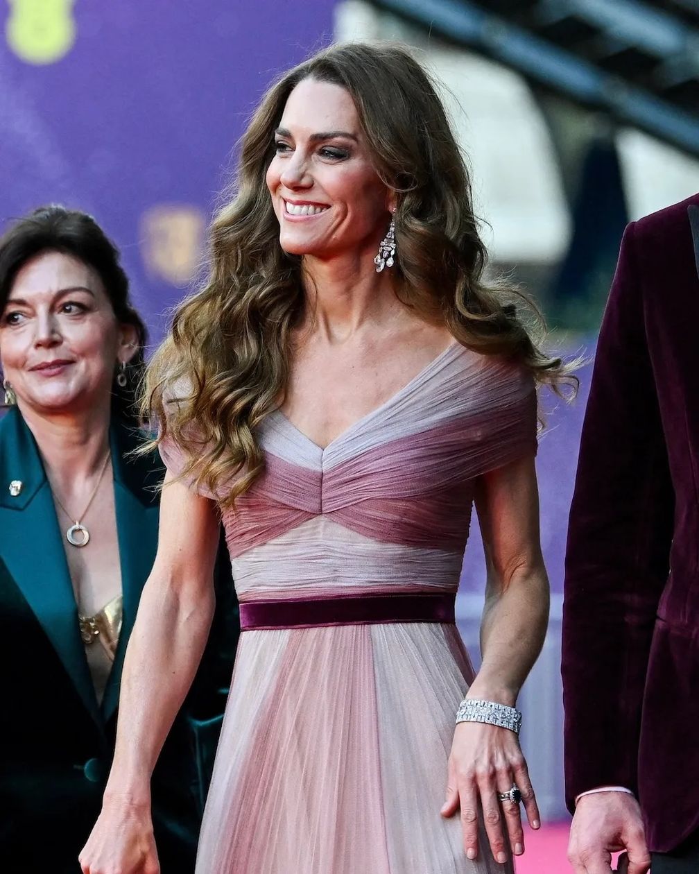 После двухлетнего перерыва Кейт Миддлтон вернулась на церемонию вручения премии BAFTA в ярко-розовом платье с открытыми плечами и бордовой бархатной лентой на талии от Gucci. Принцесса Уэльская надела свое знаменитое помолвочное кольцо с бриллиантами и сапфиром, которое ранее носила принцесса Диана, и бриллиантовый браслет королевы Марии в стиле ар-деко.