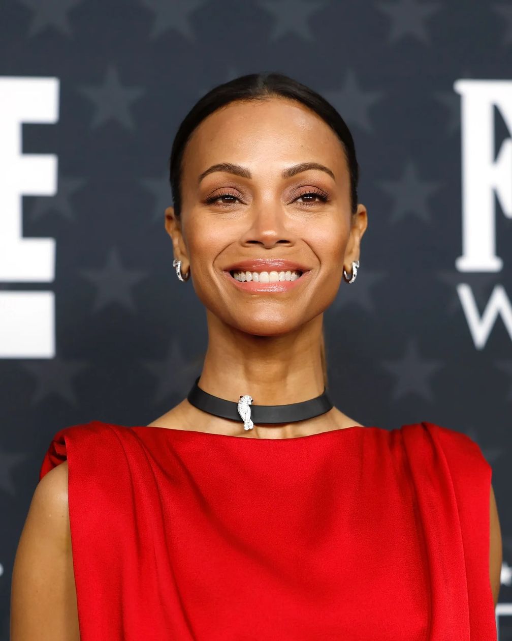 Зои Салдана была одета в ярко-красное платье от Yves Saint Laurent (стилист Петра Фланнери). Звезда дополнила свой ансамбль черным чокером Panthère с подвеской с природными бриллиантами и маленькими бриллиантовыми серьгами-обручами.