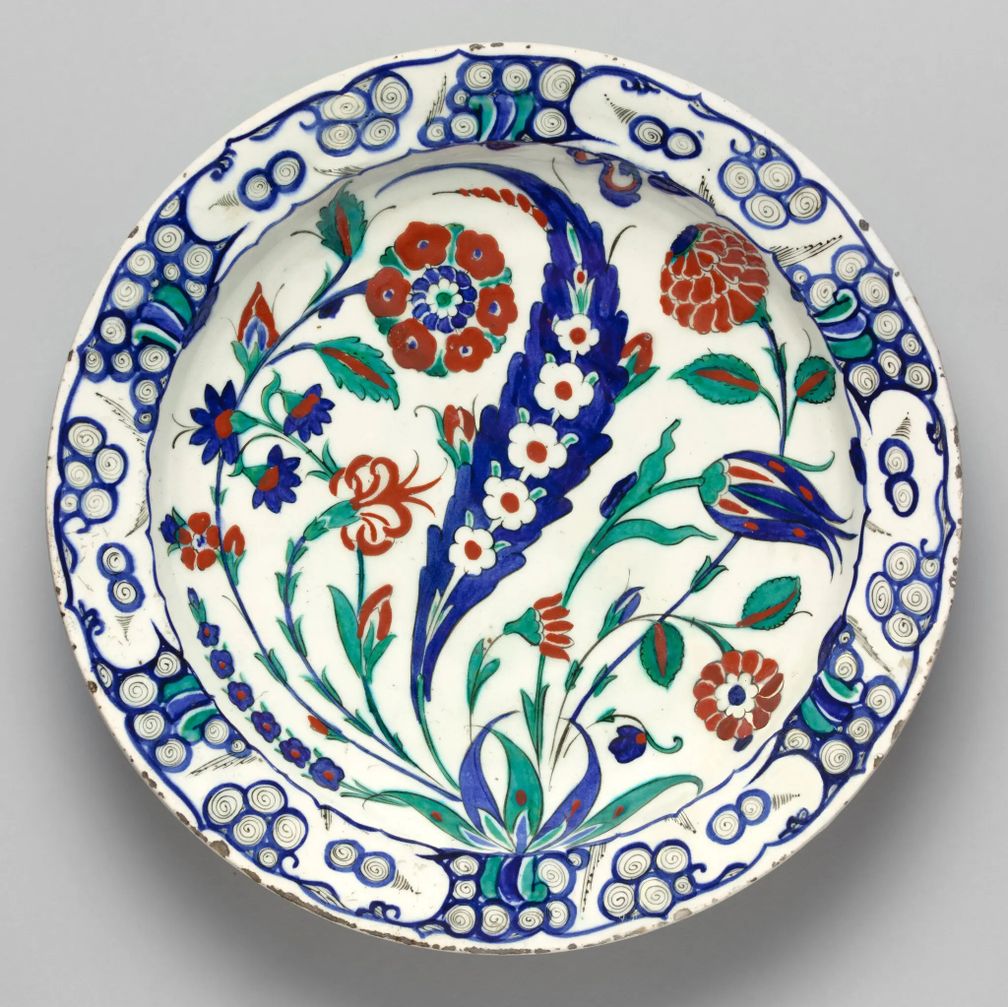 Блюдо с синим листом саза, тюльпанами и розами из Изника, Турция, около 1580 г. (Department of Culture and Tourism, Abu Dhabi/APF):