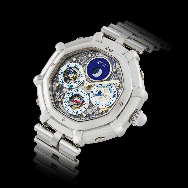 Платиновые скелетонизированные наручные часы Gérald Genta с минутным репетиром и вечным календарем (Christie’s):