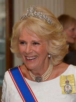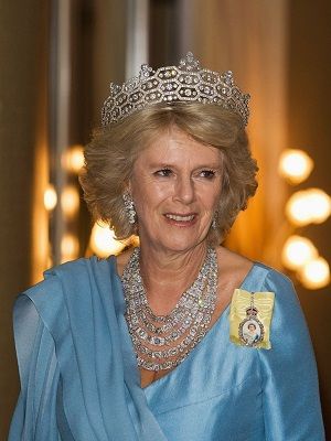 Камилла часто появляется на официальных мероприятиях в пятиярусном бриллиантовом ожерелье и тиаре с геометрическим узором в виде шестигранников с бриллиантовыми вставками.