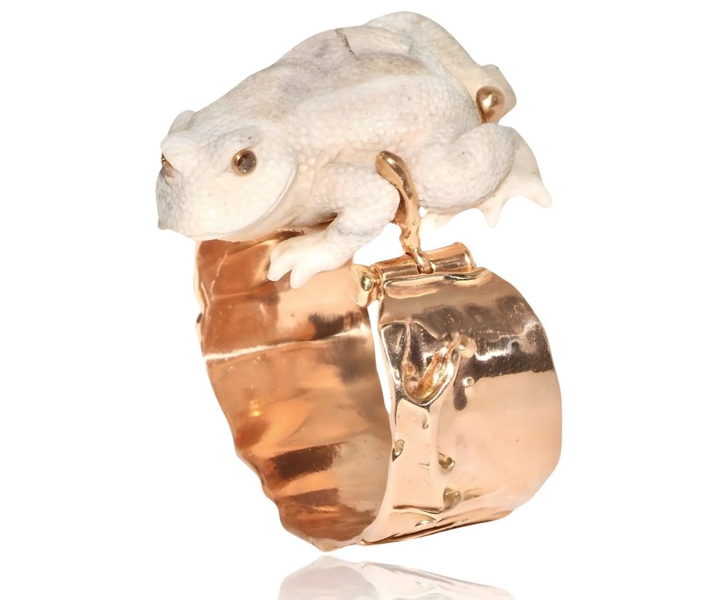 Луна Скамуцци, основавшая миланский бренд Lucifer Vir Honestus, поместила съемную лягушку из окаменевшей слоновой кости с бриллиантовым отливом на заднюю часть своей новой манжеты из 14-каратного розового золота: