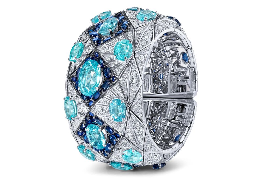 По его словам, на то, чтобы пройти путь от эскизов, CAD-чертежей и 3-D печати до закрепления сапфиров и бриллиантов, а также основного турмалина параиба весом 52,12 карата, ушел год. Манжета была представлена в январе, во время Недели моды, в парижском бутике ювелира.