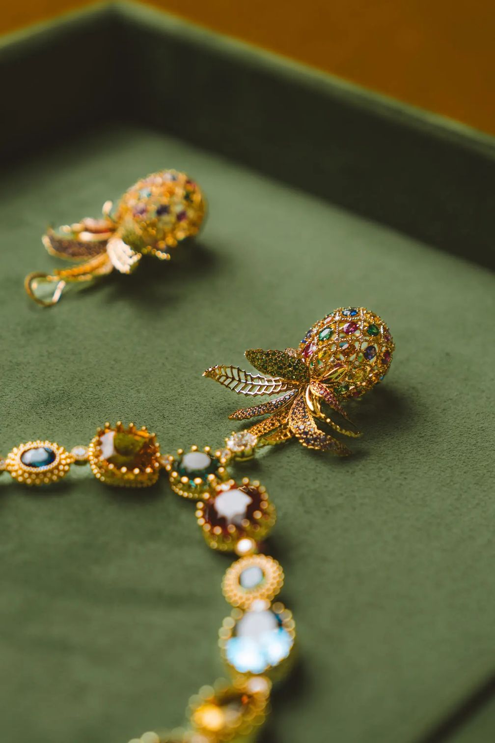 В ожерелье из 18-каратного золота, украшенном 14 видами драгоценных камней – включая аквамарин, рубеллит, танзанит, императорский топаз, сапфир и турмалин – общим весом 172 карата, вставлен бриллиант весом 1 карат огранки Mellerio, с которого свисает подвеска в форме ананаса. Инкрустированную драгоценными камнями золотую подвеску можно снять и носить как серьгу. Дизайн отсылает к обоям с узором в виде ананасов в покоях королевы, напоминая о временах, когда этот тропический фрукт считался символом богатства и экзотики.