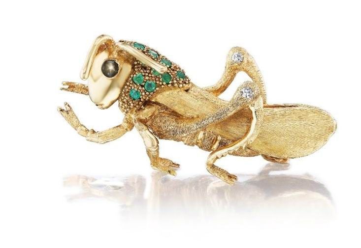 На булавке Celestial Serenade от Vivienne Charles изображен сверчок, облаченный в 14-каратную позолоченную броню, украшенную двумя бриллиантами весом 0,5 карата и 20 изумрудами, а блеск в его глазах сияет черными звездчатыми сапфирами: