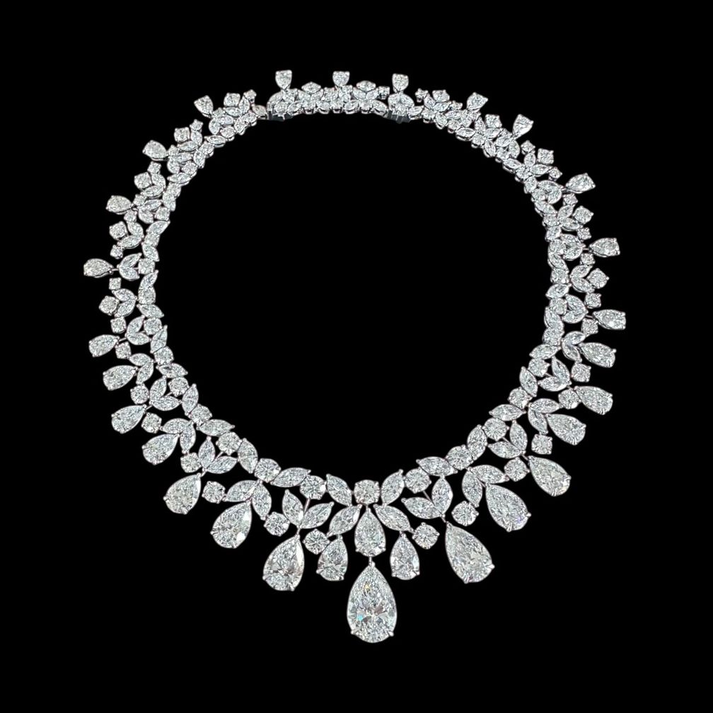Комплект, состоящий из более чем 204 карат бриллиантов цвета D–F и чистоты VVS+ в платиновой оправе, — шедевр высокого ювелирного искусства. На его создание потребовалось более 600 часов кропотливой работы в антверпенской мастерской LEVUMA, известной творениями музейного уровня как для коллекционеров, так и для королевских особ.