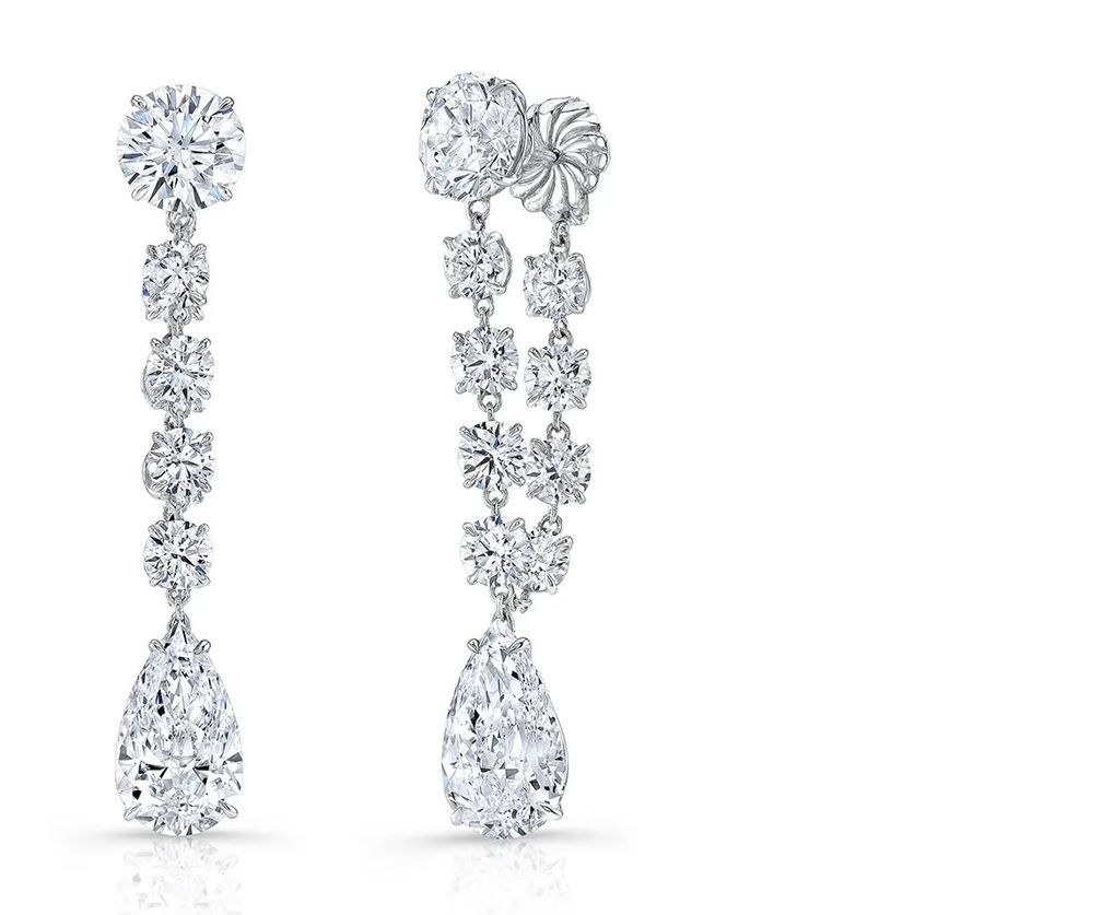 Бриллиантовые серьги, разработанные Anita Ko for Forevermark, имели исключительную грушевидную форму бриллиантовых капель – одна из них покоилась на одном ряду круглых бриллиантов, а другая свисала с бриллиантовой цепочки – общим весом 26,65 карат.