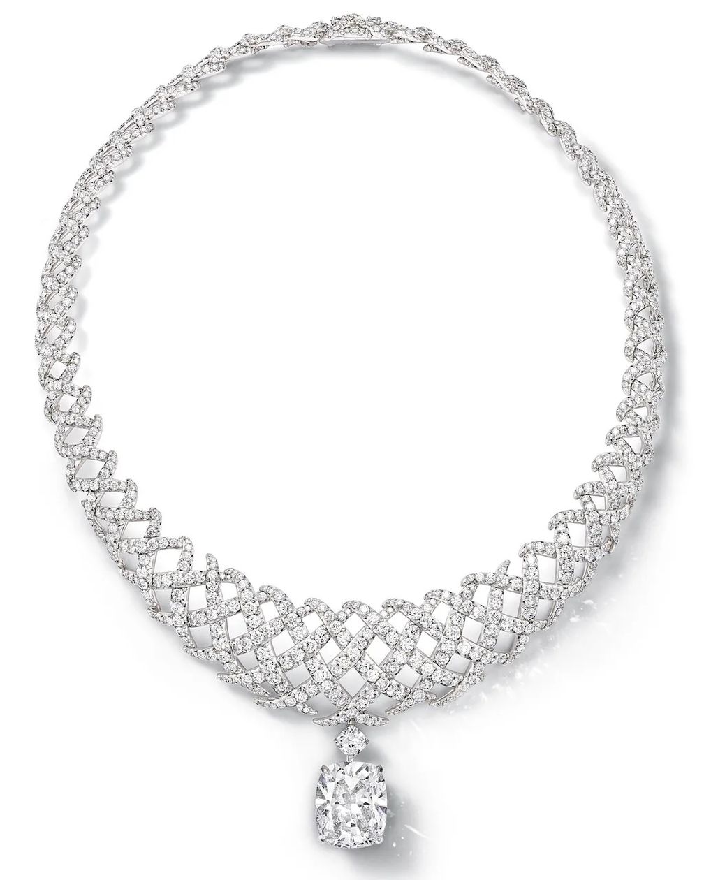 Бриллиантовое колье Jasmine с бриллиантом цвета D, безупречной чистоты, типа IIa, весом 18,8 карата, огранки кушон от Tiffany & Co. Коллекция Blue Book 2026: Hidden Garden (любезно предоставлено Tiffany & Co.):