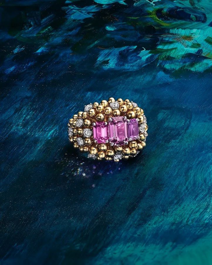 Кольцо Bloom с розовыми и фиолетовыми сапфирами огранки изумруд и природными бриллиантами от Tiffany & Co. Коллекция Blue Book 2026: Hidden Garden (любезно предоставлено Tiffany & Co.):