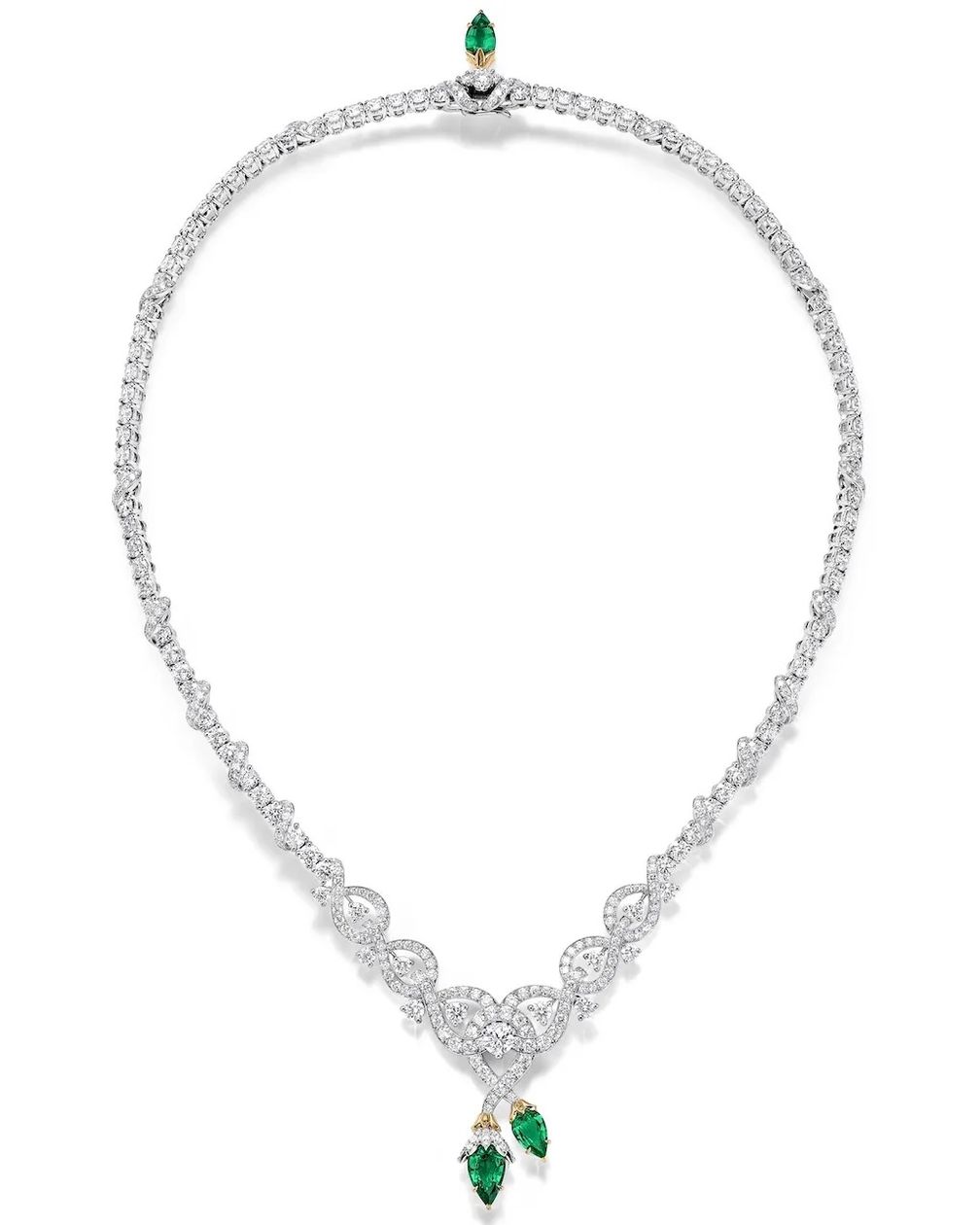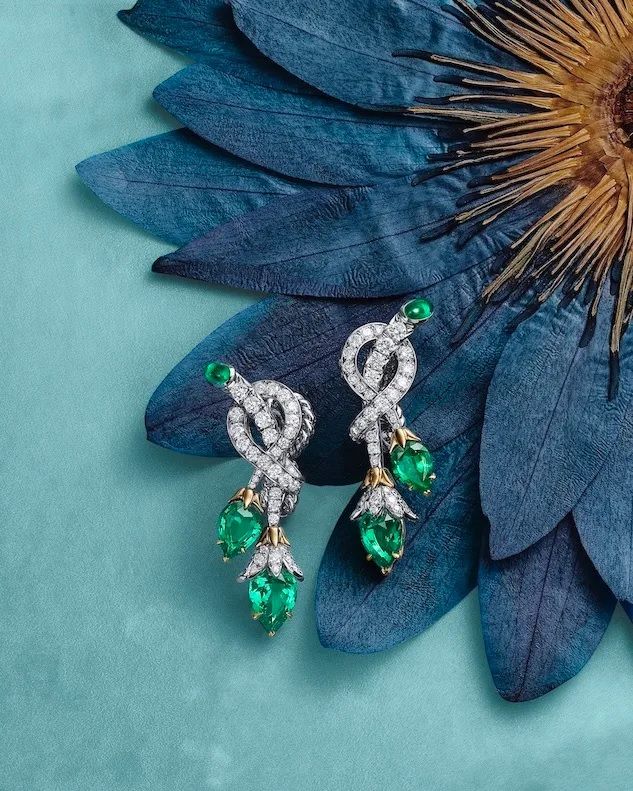 Дизайн Twin Bud переосмысливает легендарный архивный мотив Шлюмберже с помощью сочлененных платиновых лоз. Смелые, ярко-зеленые грушевидные замбийские изумруды-кабошоны дополняют сияющий бриллиантовый сет, словно только что распустившиеся два бутона-близнеца.