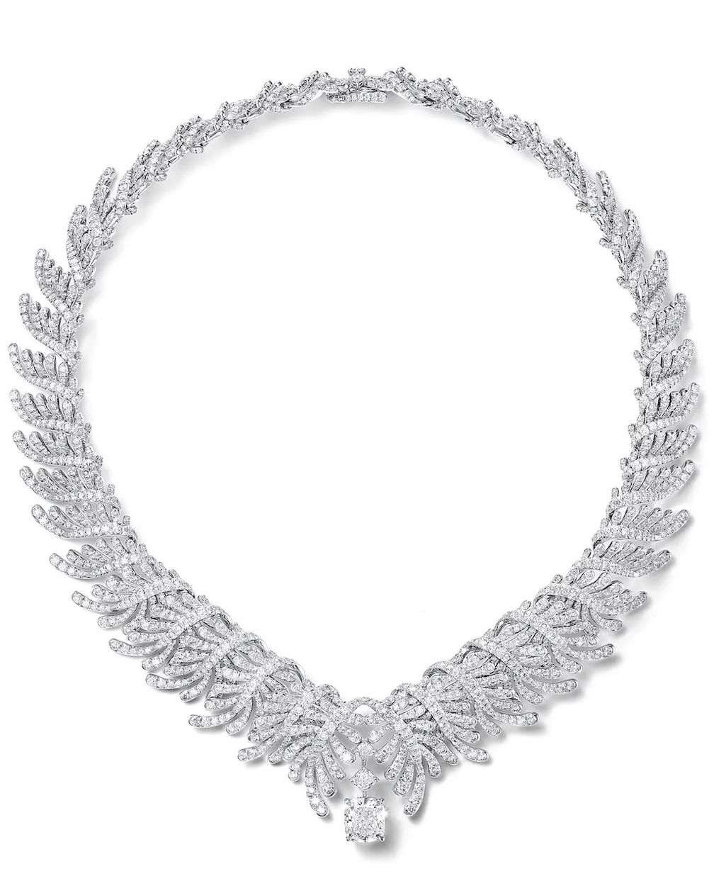Бриллиантовое колье Palm с бриллиантом огранки кушон, весом 4,26 карата от Tiffany & Co. Коллекция Blue Book 2026: Hidden Garden (любезно предоставлено Tiffany & Co.):