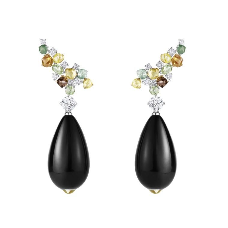 Серьги сочетают в себе смелые черные капли из гагата с рассыпанными необработанными и отполированными бриллиантами фантазийных цветов, расположенными в органичных кластерах. С ручной резьбой по гагату и сложной оправой из бриллиантов они воплощают жизненную силу и щедрость африканского ландшафта, демонстрируя развивающееся мастерство De Beers и связь с его алмазодобывающими корнями.