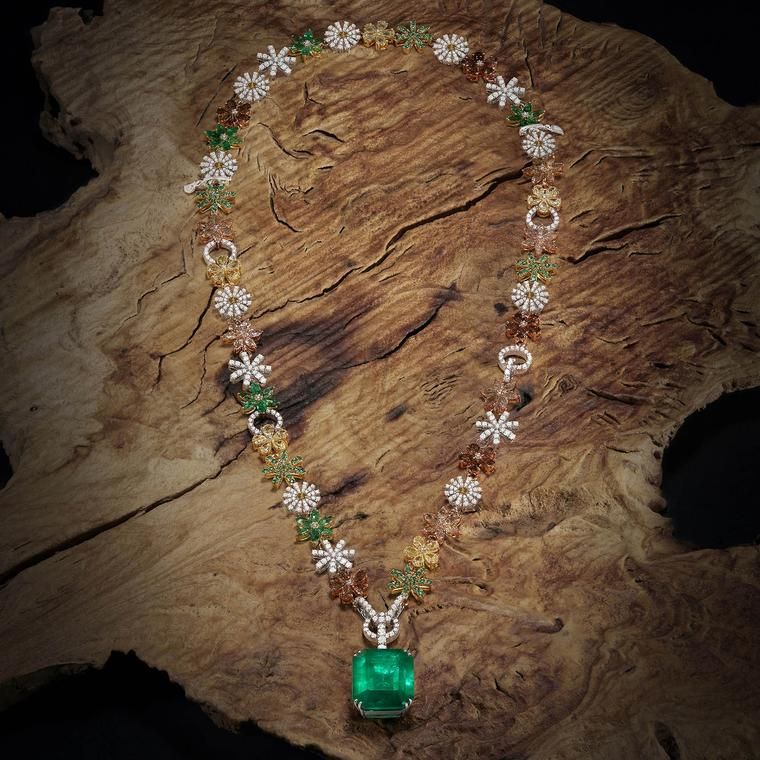 Для создания колье Ode All’Italia Дом Damiani черпал вдохновение в пейзажах и культурном наследии своей родины. Центральное место в колье занимает колумбийский изумруд огранки кушон, весом 30,25 карата, обрамленный яркой композицией из желтых и оранжевых сапфиров, спессартинов, цаворитов и бриллиантов.