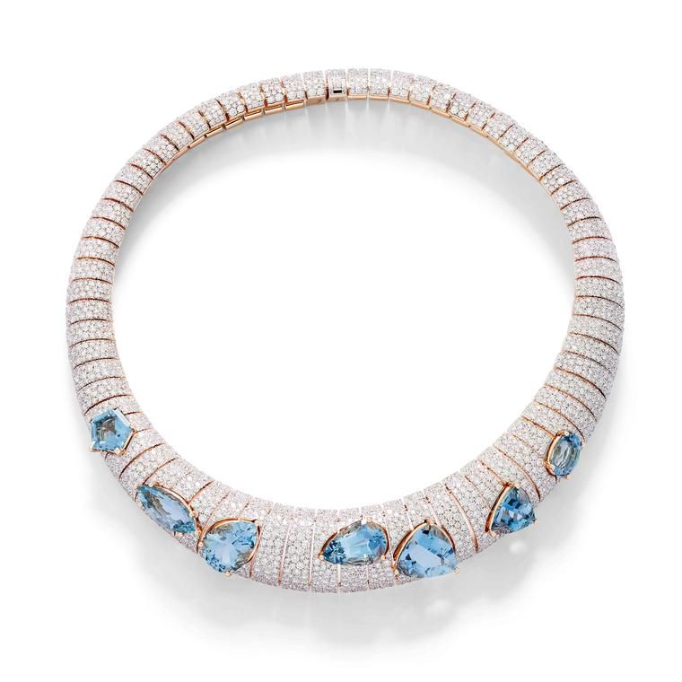 Семь аквамаринов, каждый из которых имеет разную форму и размер, асимметрично расположены, добавляя яркий голубой оттенок к графичному объему ожерелья. Asimmetrico – это яркий пример инженерного мастерства и хроматического вкуса Pomellato, переосмысленный в современном стиле.