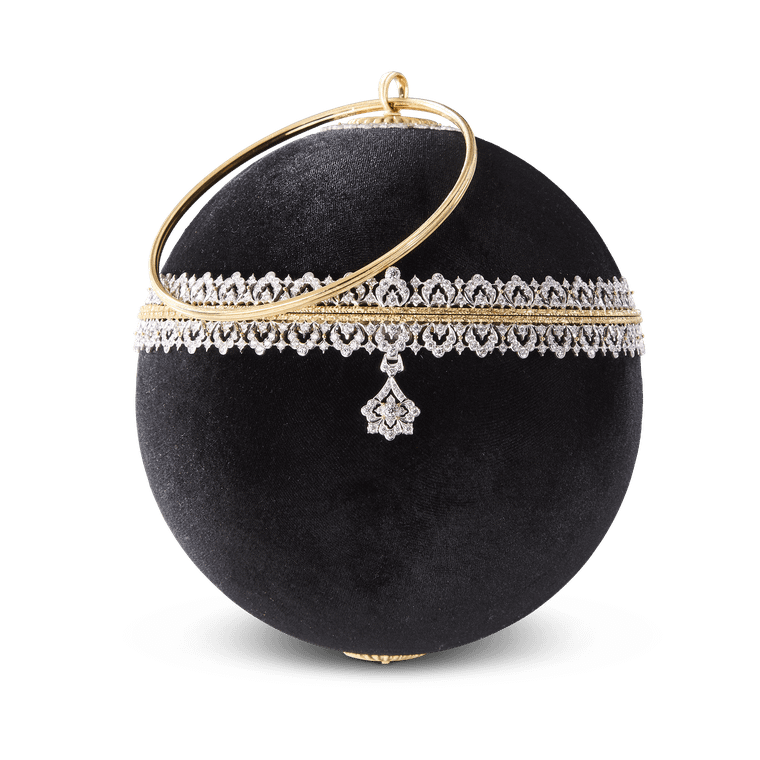 В этом изделии, вдохновленном архивными клатчами 1920-х годов, классический минодьер переосмыслен как украшение, которое можно носить с собой. Черный эластичный бархат создает скульптурную основу для украшения в виде гирлянды из белого золота и бриллиантов, обрамляющей шар подобно кружевной диадеме. Завершает композицию ручка в виде браслета из желтого золота – изысканная, функциональная и безошибочно узнаваемая в стиле Buccellati.