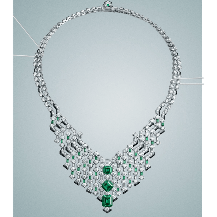 Колье Traforato, входящее в коллекцию ювелирных украшений Cartier En Équilibre, играет со светом, геометрией и цветовой гармонией. Его ажурная сетчатая структура демонстрирует ритмичное сочетание бриллиантов, изумрудов и оникса – трех фирменных цветов Cartier.