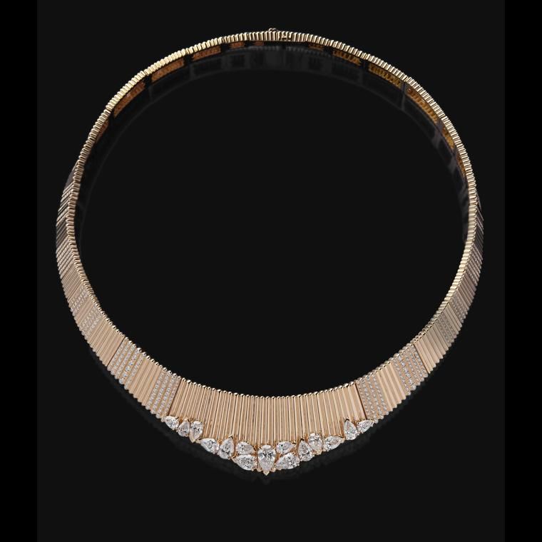 Repossi возвращается к своим истокам с Blast, скульптурными высокими ювелирными изделиями, в основе которых мотив бесконечной золотой нити. Выдающееся колье состоит из тщательно подобранных золотых слитков, отполированных до зеркального блеска и украшенных 15 бриллиантами грушевидной формы, общим весом 6,77 карата и 720 бриллиантами pavé.
