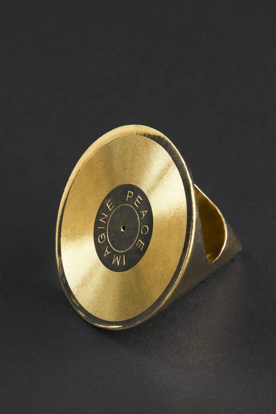 Кольцо из желтого и белого золота от Оно – одно из первых украшений, представленных на новой выставке ювелирных изделий 45 художниц в Музее прикладного искусства Кельна, известном как MAKK, в Германии. Кольцо Оно, выполненное в форме винилового диска с надписью Imagine Peace, отсылает к песне 1971 года «Imagine», которую она написала вместе с Ленноном.