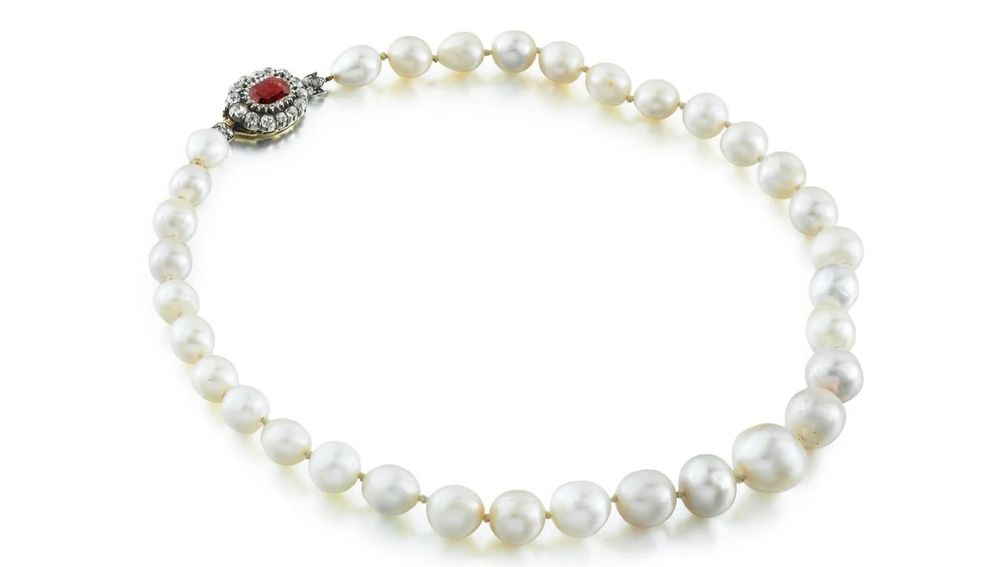 Sotheby’s представит это колье, состоящее из 33 округлых, овальных, пуговичных и каплевидных природных жемчужин, а также застежки с восьмиугольным гранатом-родолитом и бриллиантами круглой огранки.