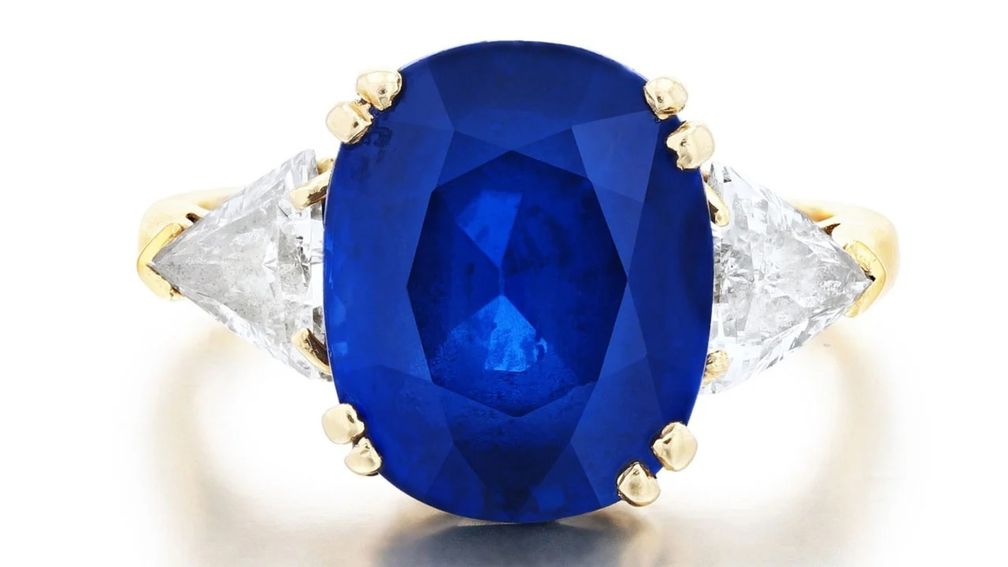 Это кольцо украшено бирманским сапфиром овальной формы, весом 7,7 карата в обрамлении треугольных бриллиантов.