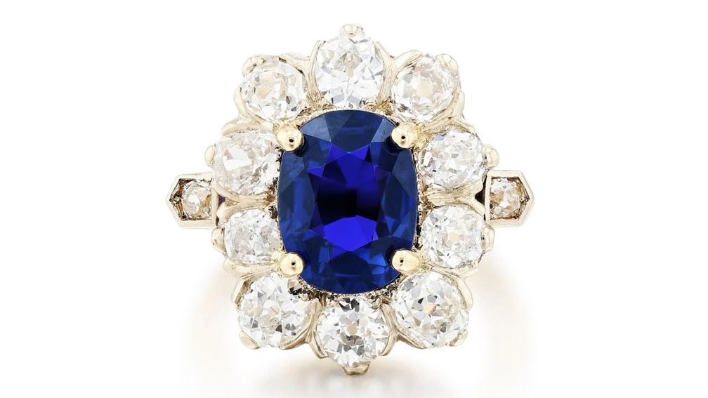 Это кольцо украшено старинным кашмирским сапфиром огранки кушон, весом 4,32 карата в обрамлении бриллиантов старинной огранки.