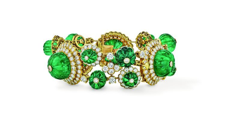 Манжета Van Cleef & Arpels с резным изумрудным узором в индийском стиле из 18-каратного золота с бриллиантами, около 1971 года, выставлена в Американском музее естественной истории (Van Cleef & Arpels):