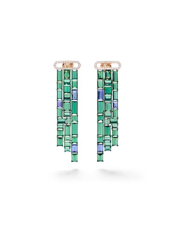 Серьги Pomellato Giardini Verticali с 52 зелеными турмалинами, 6 фиолетово-синими танзанитами, бриллиантами, зеленым титаном из 18-каратного золота (Pomellato):