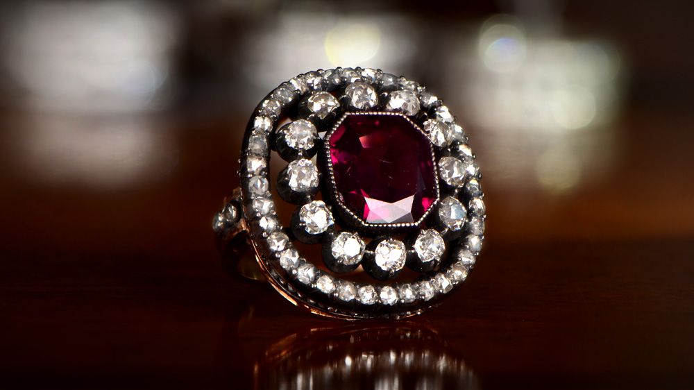 Серебряное кольцо с гранатом и ореолом из бриллиантов: