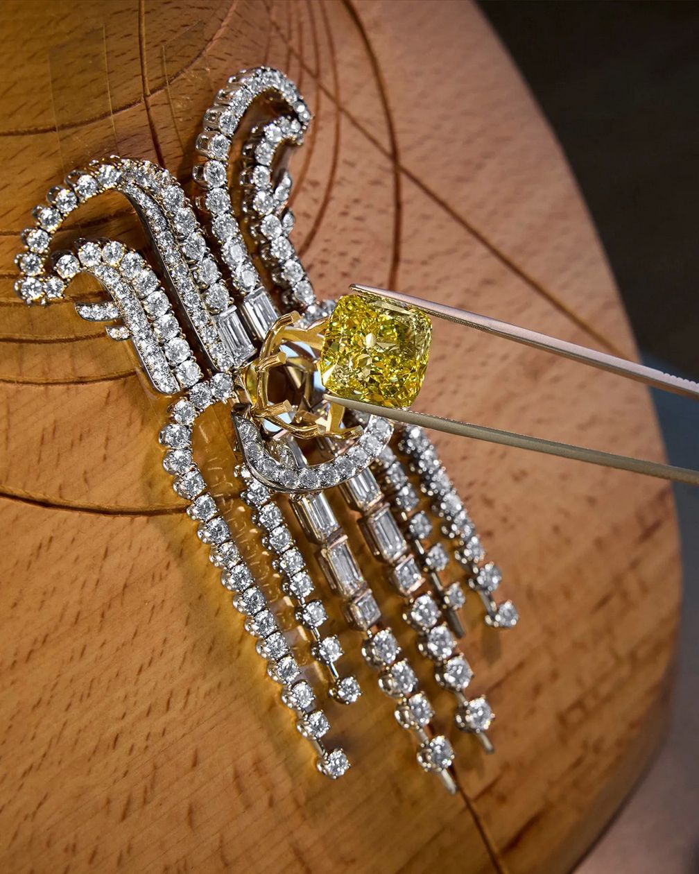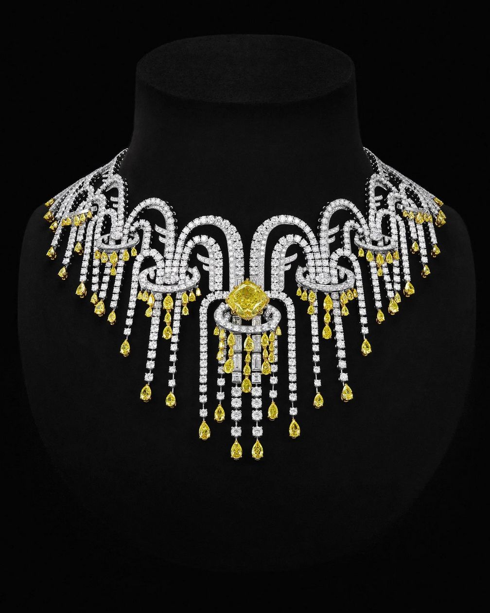 Фантазийный ярко-желтый бриллиант в центре юбилейного колье Eaux d’Artifice специально был огранен до веса 20,25 карата, соответствующего знаменательному году.