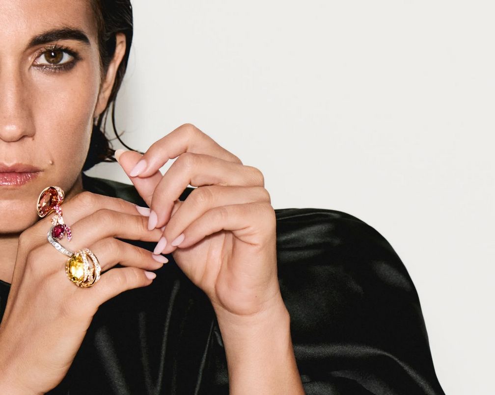 В кольцах Sunset с крупными центральными камнями — императорским топазом, желтым сапфиром или шпинелью — ее дизайн отошел от образности. Еще дальше пошел комплект Fortuna, украшенный рубинами, в котором гипнотический поток воды стал абстрактным.