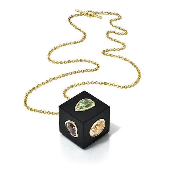 Колье Cube из 18-каратного золота с турмалином параиба весом 2,03 карата, аквамарином весом 1,42 карата, цирконом весом 3 карата, розовым турмалином весом 3 карата, аметистом весом 1,63 карата и вставкой из черного жадеита от Rachel Quinn: