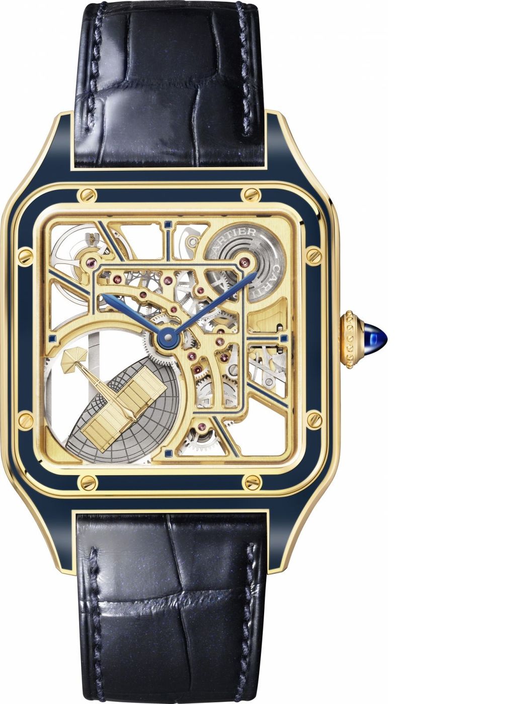 Скелетонизированный механизм 9629 MC оснащен миниатюрной копией самолета Demoiselle, созданного пилотом Альберто Сантосом-Дюмоном, в честь которого и названы эти великолепные часы Cartier.