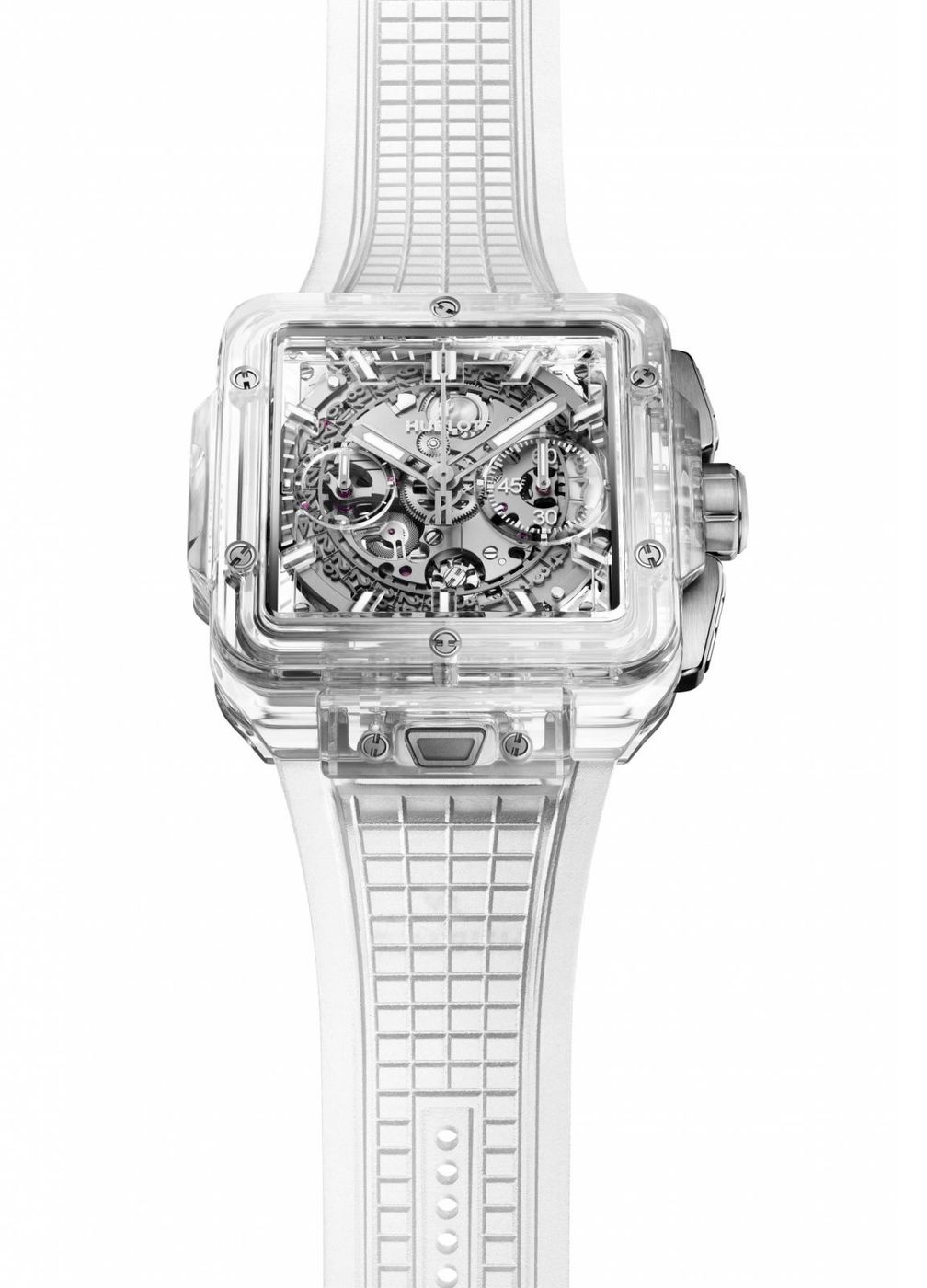Сапфировое стекло обеспечивает абсолютную прозрачность, открывая взору внутренний механизм хронографа HUB1280 Unico с функцией flyback, идеально адаптированный к квадратным размерам. Серия выпущена ограниченным тиражом в 250 экземпляров.