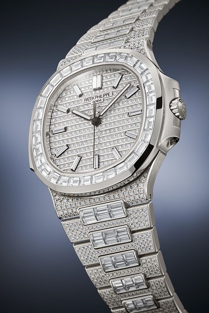 В этой новой модели Nautilus Haute Joaillerie Patek Philippe соединил силуэты круглых бриллиантов и бриллиантов багетной огранки, создав часы, которые завораживают своей изысканностью. Часы изготовлены из белого золота и инкрустированы 1285 бриллиантами классической огранки общим весом 6,43 карата и 195 бриллиантами багетной огранки общим весом 13,27 карата.