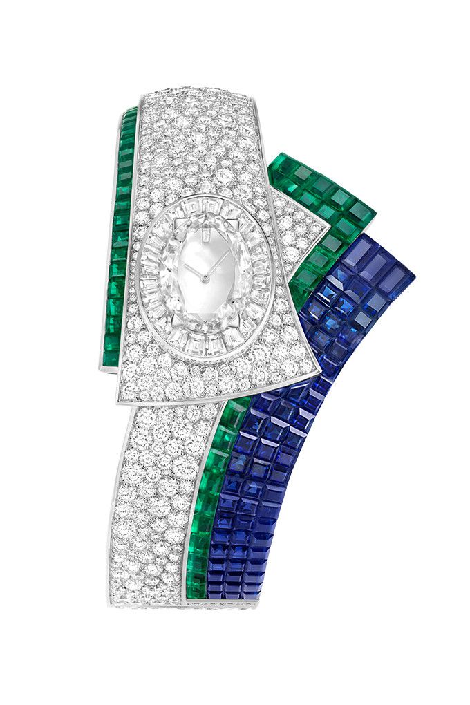 Парижский ювелирный дом Van Cleef & Arpels считает мир высокой моды одним из своих главных источников вдохновения, и эти новые часы напоминают изящные складки ленты на запястье. Часы выполнены из белого и розового золота с бриллиантами в виртуозной снежной оправе. На левом краю ленты — ряд изумрудов, а на правом — фирменная традиционная застежка Mystery Set с изумрудами и сапфирами. Циферблат, обрамленный перламутром, — самая изящная и захватывающая дух деталь. На самом деле это бриллиант овальной огранки весом 3,72 карата, настолько безупречный, что за ним открывается идеальный, четкий обзор циферблата.