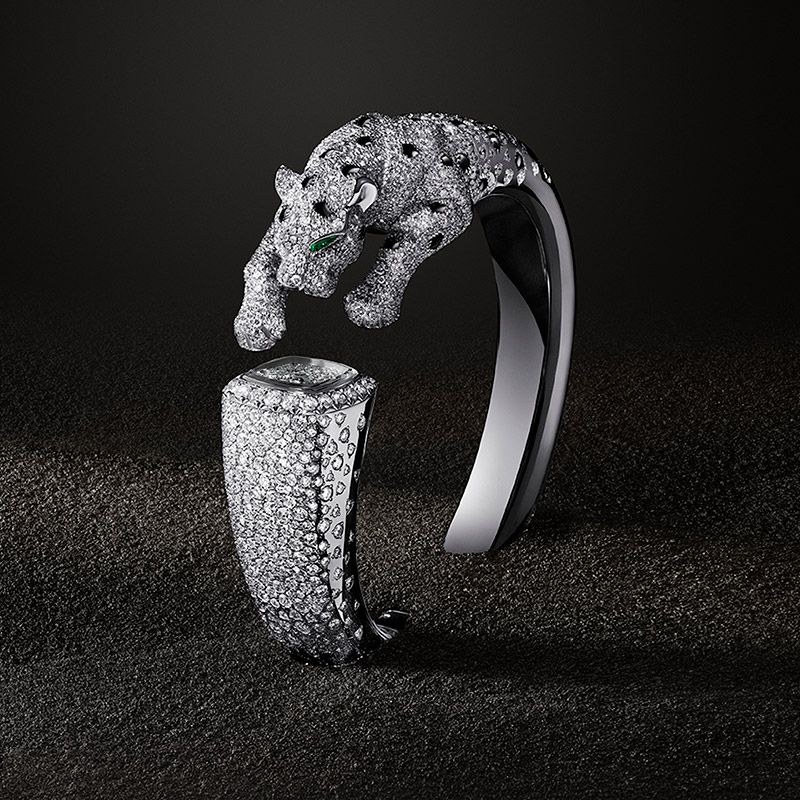 Одно из неподражаемых умений Cartier, связанных с его культовой моделью Panthère, — превращение ювелирных изделий в функциональные произведения искусства. Этот браслет из белого золота изображает любимую парижским Домом кошку, нежно потягивающуюся, тянущуюся лапой к изящно изогнутому циферблату часов. Фигурка оживлена изумрудными глазами, носом и пятнышками из оникса, а также 1103 бриллиантами общим весом 11,90 карата. Снежная, «меховая» инкрустация придают сверкающей шерсти пантеры живой вид.
