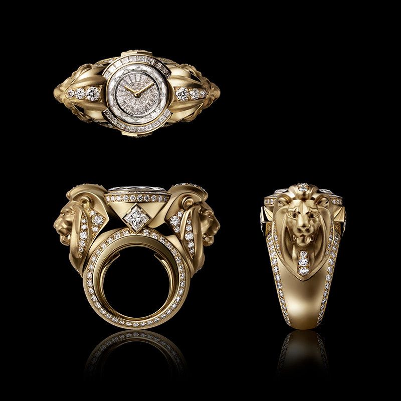 Изящная отделка и форма желтого золота создают двух львов. Основание часов с двух сторон украшено бриллиантом огранки принцесса 0,42 карата. Остальная часть часов-кольца украшена 134 бриллиантами классической огранки общим весом около 3,21 карата. Циферблат украшен 57 бриллиантами багетной огранки общим весом 0,89 карата, а безель — 20 бриллиантами багетной огранки общим весом 0,6 карата.