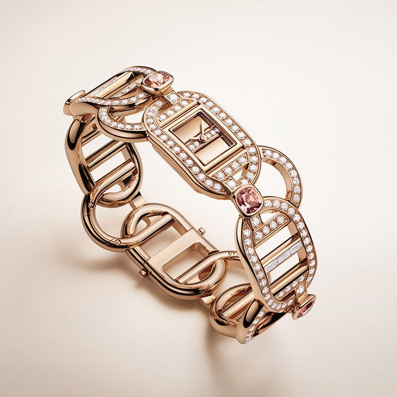 Компания Hermès представила наручные часы из коллекции Maillon Libre, в которых звенья браслета превращены в структурированный браслет-манжету. Эта великолепная модель из розового золота украшена четырьмя терракотовыми турмалинами огранки кушон, 218 бриллиантами классической огранки общим весом около 3,96 карата и 12 бриллиантами багетной огранки общим весом около 1,08 карата.