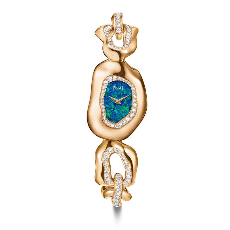 В этом году Piaget сосредоточился на форме, и среди часов высокого ювелирного искусства, пожалуй, самым очаровательным воплощением стала модель Essentia. Вместо четкой геометрической формы эти часы-манжета обладают биоморфной текучестью. Они напоминают гальку, форму которой придала струящаяся вода. Это свидетельство мастерства ювелирного дома в обработке золота, создающего столь органичное ощущение. Корпус и браслет из желтого золота подчеркнуты плавными волнистыми линиями бриллиантов классической огранки и великолепным опаловым циферблатом.