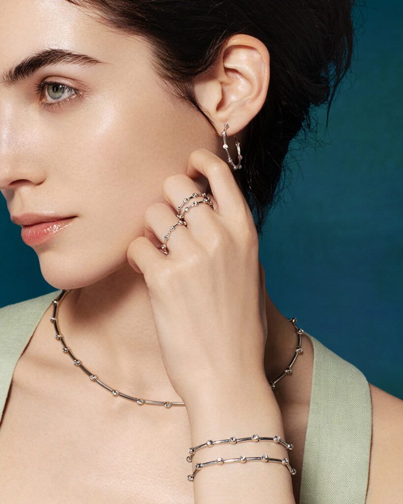 Многие точки улавливают свет, наполняя украшения изысканностью и элегантной простотой. Серия украшений Satellite, выполненная из серебра и серебра с золотым покрытием, состоит из двух колье, двух браслетов, шести пар серег и двух колец.
