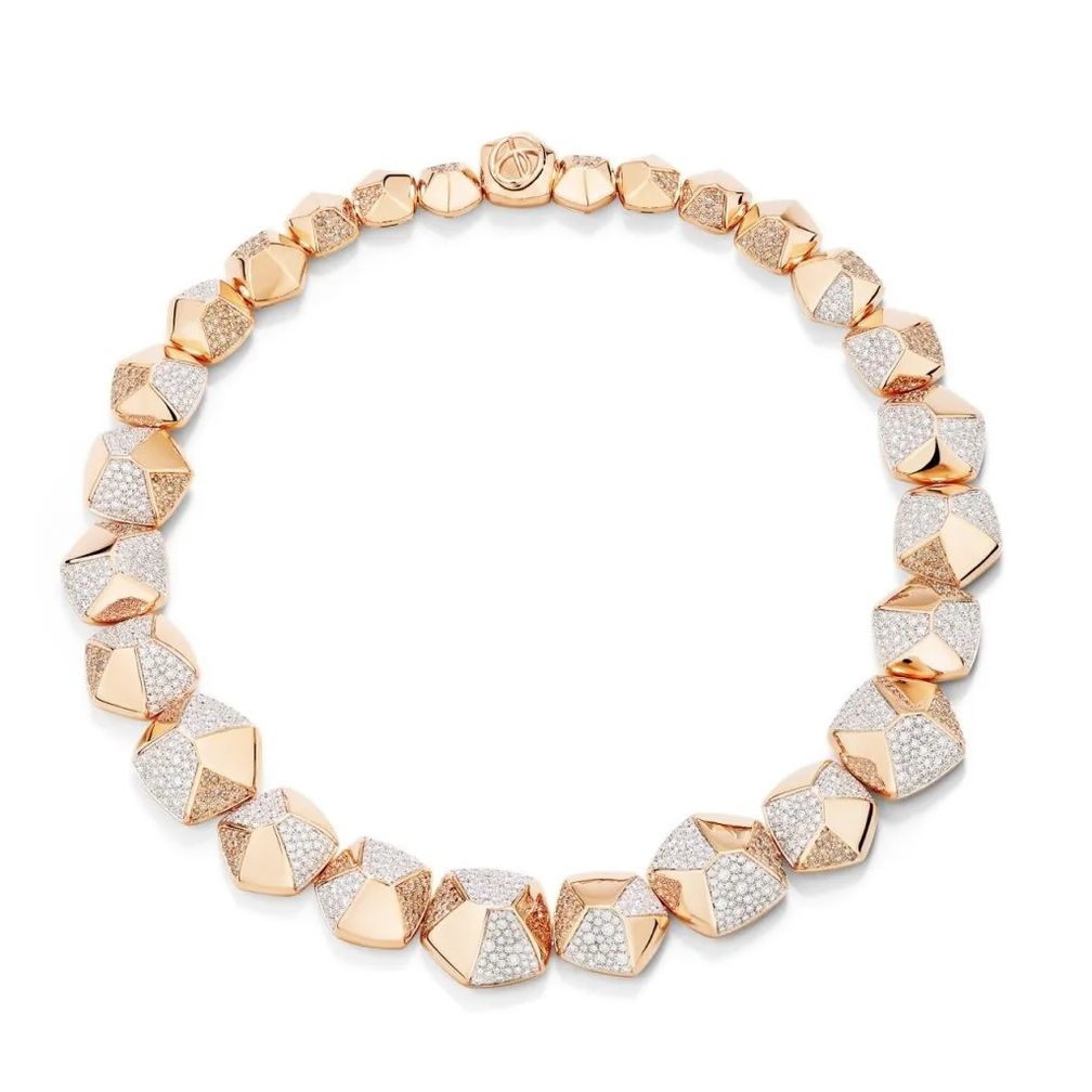 Линия Pentagoni отдает дань ювелирному наследию Pomellato геометрическим дизайном, который придает пятигранным формам драгоценных камней трехмерный эффект, чередуя полированное золото с поверхностями, украшенными бриллиантами pavé. Колье с золотыми самородками, украшенными белыми и коричневыми бриллиантами, является звездой коллекции.