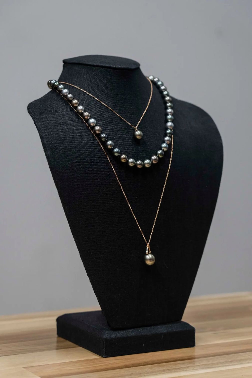 Ожерелья из таитянского жемчуга: подвески TreasureLock из 18-каратного золота (сверху и снизу) и нить (в центре) (Hiroko Masuike/The New York Times):