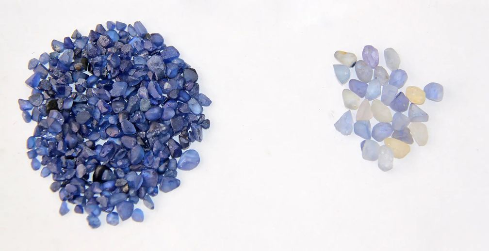Нагревание камней повышает прозрачность и интенсивность цвета, что видно по контрасту между необработанными сапфирами, добытыми на Шри-Ланке (справа), и сапфирами, подвергнутыми термической обработке (слева) (Hanco Zwaan/Netherlands Gem Laboratory):